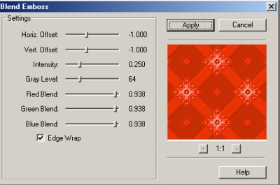 Filters/FM Tile Tools/Blend Emboss and again use the default settings as you did